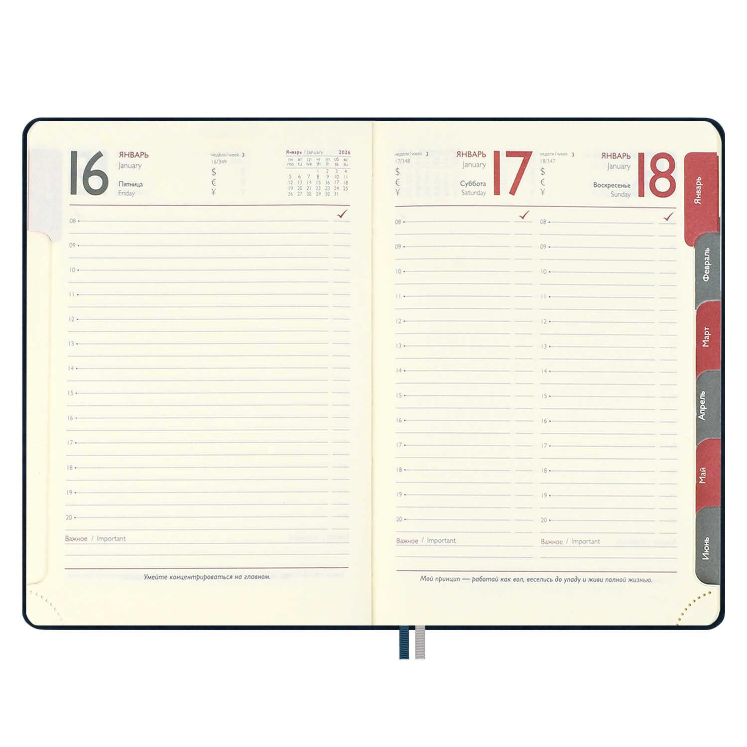 | | Ежедневник датированный на 2026год А5 кожзам (линейка) ( 352 страницы) (ФЕНИКС) (твердая обложка) ТивГлос Думай син (п/упаковка)  Ежедневник датированный 2026 ESCALADA, #ДУМАЙ КАК МИЛЛИАРДЕР, А5, 176 л., ТИВОЛИ ГЛОСС СИНИЙ (кожзам: 146x211 мм, твёрдый переплёт, запаянный край, материал обложки: искусственная кожа "Тиволи глосс"; декор: блинтовое тиснение; способ крепления блока: ниткошвейный; вн. блок: 176 л., тонированный офсет 70 г/м?, печать в две краски (линия), справочный материал: есть; перфорация углов блока: есть; закладка/-и: два ляссе; каптал: есть; форзац: печать пантоном; особенности: в блоке использованы мотивирующие высказывания из книги "Думай как миллиардер", помогающие сформировать правильное отношение к финансам, профессиональной деятельности, своим способностям и к жизни в целом, вырубка блока по месяцам; персонализация возможна: да; индивидуальная упаковка: промостикер + ПЭТ-пакет) |