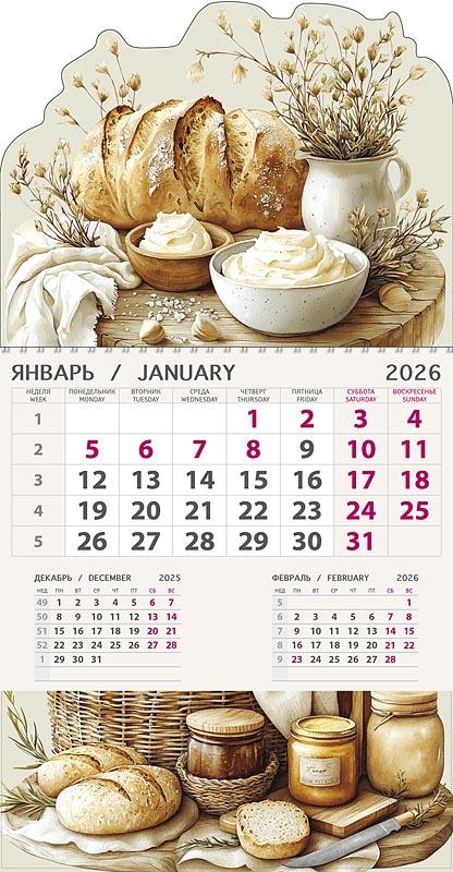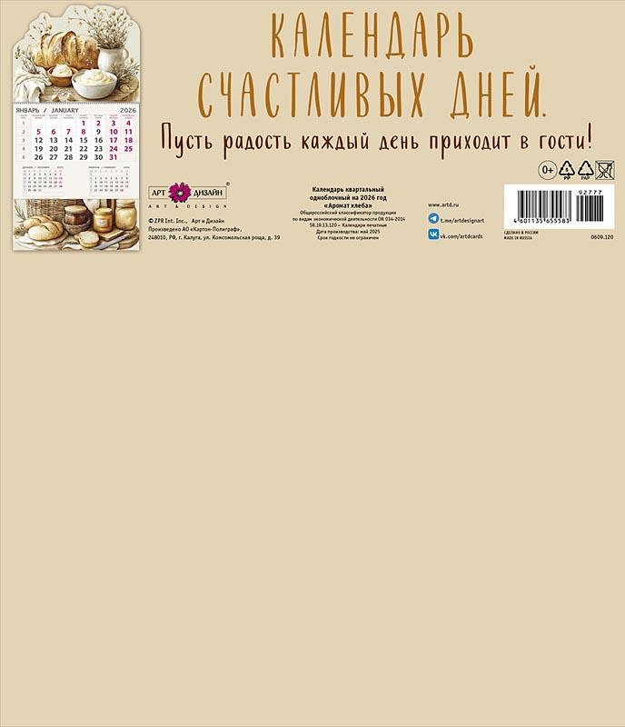| Календарь настенный квартальный на 2026год на 1 спирали 1 блок (Арт и Дизайн) 0609 120 29, 5*42см Аромат хлеба (п/упаковка с европодвесом)  Настенный календарь - это универсальный атрибут дома и офиса. Помимо своей основной функции - сообщать текущую дату; он помогает планировать дела, подводить итоги дня, недели и месяца. Яркий и красивый календарь может служить украшением стены и оживлять дизайн помещения. Календарями пользуются бизнесмены и политики, менеджеры и преподаватели, медики, студенты и школьники. Его можно использоватьи в домашнем обиходе; отмечать события и дела, связанные с жизнью семьи, обучать ребенка ориентироваться в днях недели. Человечество изобрело календарь для того, чтобы иметь возможность планировать будущее. |