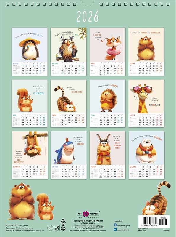 | Календарь на 2026год настенный на спирали (Арт и Дизайн) 0613 241 29*39см Жизнь замечательных котов (п/упаковка с европодвесом)  Настенный календарь - это универсальный атрибут дома и офиса. Помимо своей основной функции - сообщать текущую дату; он помогает планировать дела, подводить итоги дня, недели и месяца. Яркий и красивый календарь может служить украшением стены и оживлять дизайн помещения. Календарями пользуются бизнесмены и политики, менеджеры и преподаватели, медики, студенты и школьники. Его можно использоватьи в домашнем обиходе; отмечать события и дела, связанные с жизнью семьи, обучать ребенка ориентироваться в днях недели. Человечество изобрело календарь для того, чтобы иметь возможность планировать будущее. |