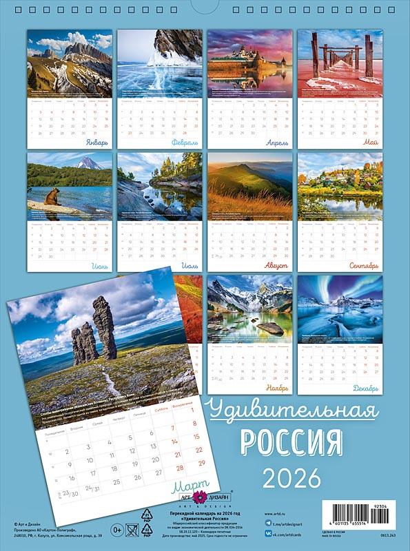 | | Календарь на 2026год настенный на спирали (Арт и Дизайн) 0613 243 29*39см Удивительная Россия (п/упаковка с европодвесом)  Настенный календарь - это универсальный атрибут дома и офиса. Помимо своей основной функции - сообщать текущую дату; он помогает планировать дела, подводить итоги дня, недели и месяца. Яркий и красивый календарь может служить украшением стены и оживлять дизайн помещения. Календарями пользуются бизнесмены и политики, менеджеры и преподаватели, медики, студенты и школьники. Его можно использоватьи в домашнем обиходе; отмечать события и дела, связанные с жизнью семьи, обучать ребенка ориентироваться в днях недели. Человечество изобрело календарь для того, чтобы иметь возможность планировать будущее. |