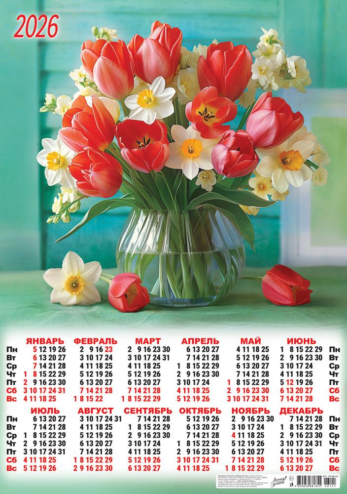 | Календарь на 2026год настенный листовой (плакат) А2 (ФОНТАНКА) ПО-26-141 Цветы Букет с тюльпанами (без лака)  Настенный календарь - это универсальный атрибут дома и офиса. Помимо своей основной функции - сообщать текущую дату; он помогает планировать дела, подводить итоги дня, недели и месяца. Яркий и красивый календарь может служить украшением стены и оживлять дизайн помещения. Календарями пользуются бизнесмены и политики, менеджеры и преподаватели, медики, студенты и школьники. Его можно использоватьи в домашнем обиходе; отмечать события и дела, связанные с жизнью семьи, обучать ребенка ориентироваться в днях недели. Человечество изобрело календарь для того, чтобы иметь возможность планировать будущее. Формат А2 (420х594мм). Бумага мелованная 80 г/м2, без лака. |