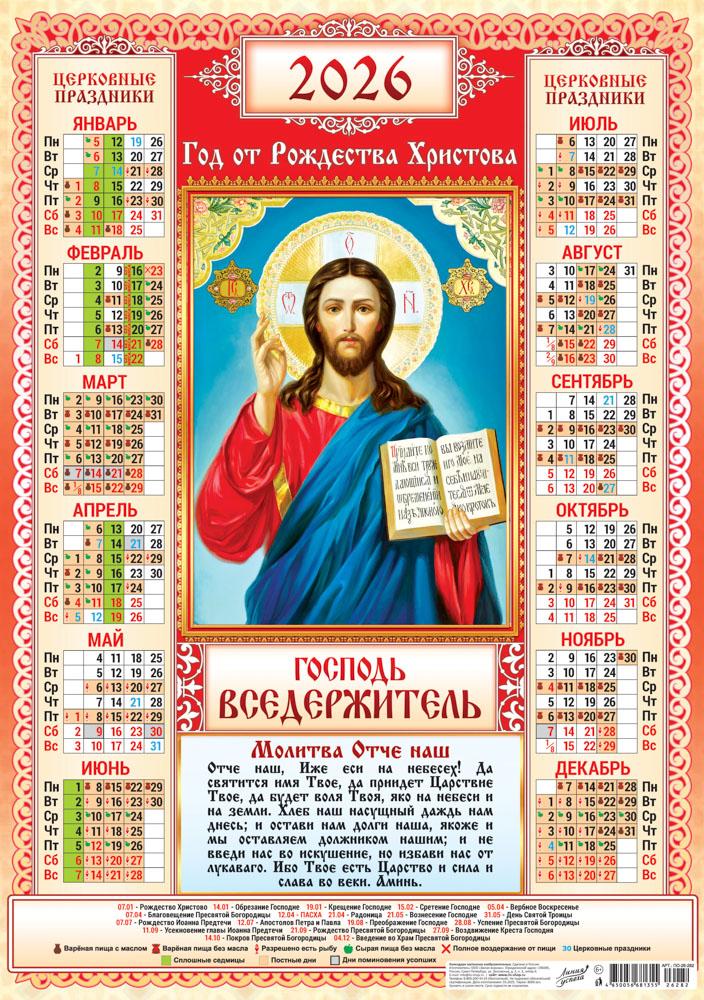 | | Календарь на 2026год настенный листовой (плакат) А2 (ФОНТАНКА) ПО-26-282 Иконы Господь Вседержитель (без лака)  Настенный календарь - это универсальный атрибут дома и офиса. Помимо своей основной функции - сообщать текущую дату; он помогает планировать дела, подводить итоги дня, недели и месяца. Яркий и красивый календарь может служить украшением стены и оживлять дизайн помещения. Календарями пользуются бизнесмены и политики, менеджеры и преподаватели, медики, студенты и школьники. Его можно использоватьи в домашнем обиходе; отмечать события и дела, связанные с жизнью семьи, обучать ребенка ориентироваться в днях недели. Человечество изобрело календарь для того, чтобы иметь возможность планировать будущее. Формат А2 (420х594мм). Бумага мелованная 80 г/м2, без лака. |