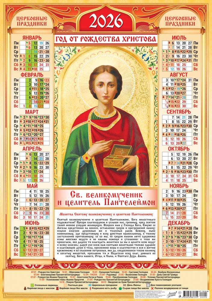 | Календарь на 2026год настенный листовой (плакат) А2 (ФОНТАНКА) ПО-26-290 Иконы Целитель Пантелеймон (без лака)  Настенный календарь - это универсальный атрибут дома и офиса. Помимо своей основной функции - сообщать текущую дату; он помогает планировать дела, подводить итоги дня, недели и месяца. Яркий и красивый календарь может служить украшением стены и оживлять дизайн помещения. Календарями пользуются бизнесмены и политики, менеджеры и преподаватели, медики, студенты и школьники. Его можно использоватьи в домашнем обиходе; отмечать события и дела, связанные с жизнью семьи, обучать ребенка ориентироваться в днях недели. Человечество изобрело календарь для того, чтобы иметь возможность планировать будущее. Формат А2 (420х594мм). Бумага мелованная 80 г/м2, без лака. |