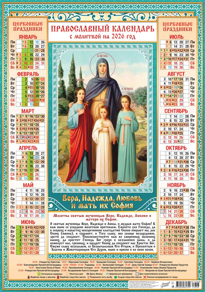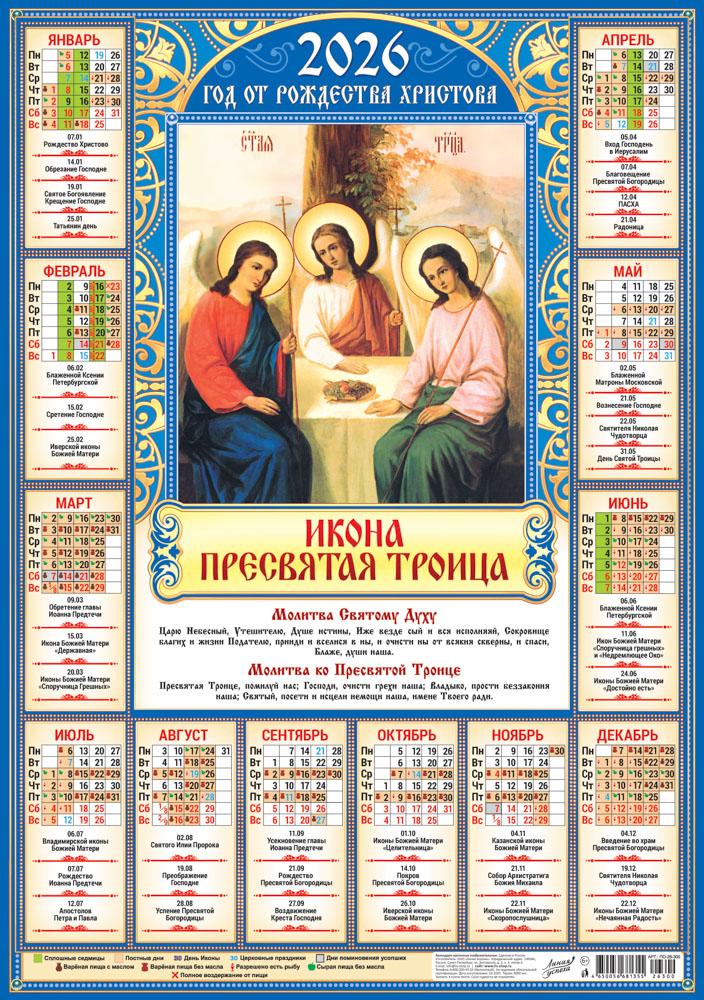 | Календарь на 2026год настенный листовой (плакат) А3 (ФОНТАНКА) ПМ-26-224 Иконы Пресвятая Троица (без лака)  Формат А3 (297х420мм). Бумага мелованная 80 г/м2, без лака. Настенный календарь - это универсальный атрибут дома и офиса. Помимо своей основной функции - сообщать текущую дату; он помогает планировать дела, подводить итоги дня, недели и месяца. Яркий и красивый календарь может служить украшением стены и оживлять дизайн помещения. Календарями пользуются бизнесмены и политики, менеджеры и преподаватели, медики, студенты и школьники. Его можно использоватьи в домашнем обиходе; отмечать события и дела, связанные с жизнью семьи, обучать ребенка ориентироваться в днях недели. Человечество изобрело календарь для того, чтобы иметь возможность планировать будущее. |