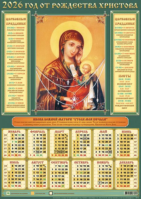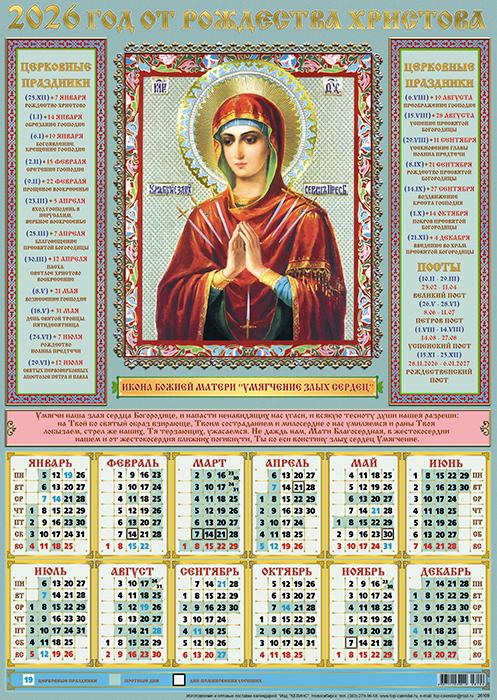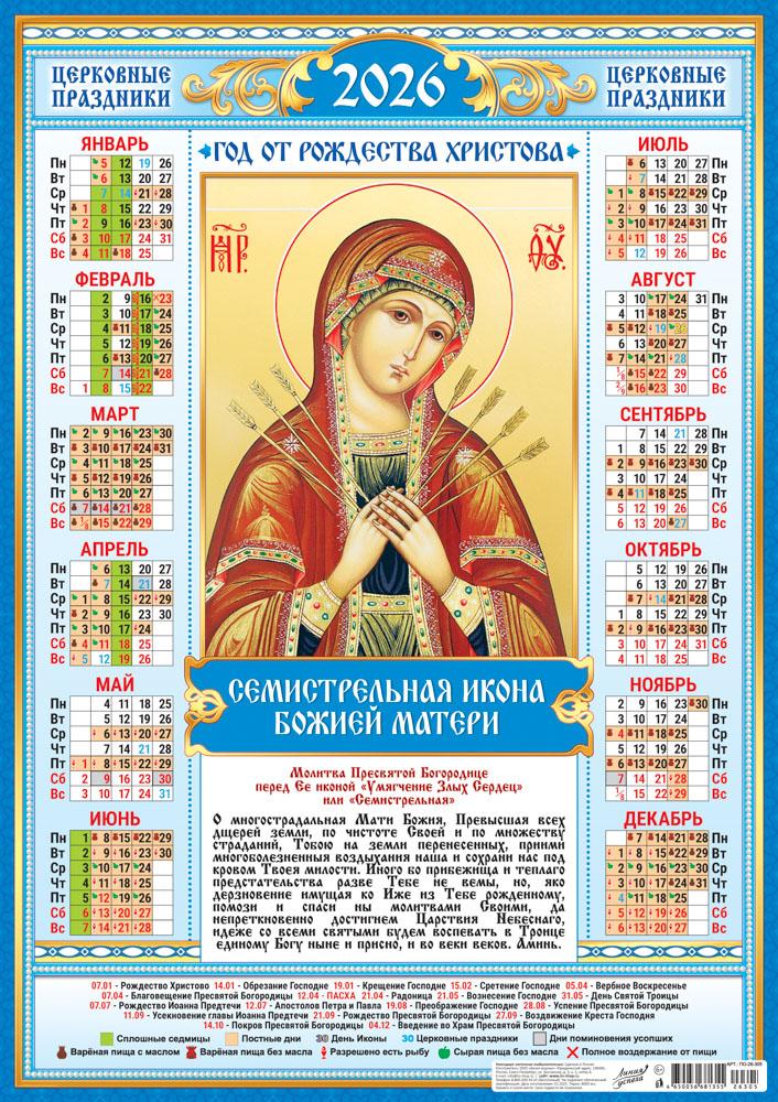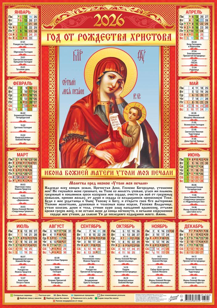 | Календарь на 2026год настенный листовой (плакат) А3 (ФОНТАНКА) ПМ-26-219 Иконы Умягчение Злых Сердец (без лака)  Формат А3 (297х420мм). Бумага мелованная 80 г/м2, без лака. Настенный календарь - это универсальный атрибут дома и офиса. Помимо своей основной функции - сообщать текущую дату; он помогает планировать дела, подводить итоги дня, недели и месяца. Яркий и красивый календарь может служить украшением стены и оживлять дизайн помещения. Календарями пользуются бизнесмены и политики, менеджеры и преподаватели, медики, студенты и школьники. Его можно использоватьи в домашнем обиходе; отмечать события и дела, связанные с жизнью семьи, обучать ребенка ориентироваться в днях недели. Человечество изобрело календарь для того, чтобы иметь возможность планировать будущее. |