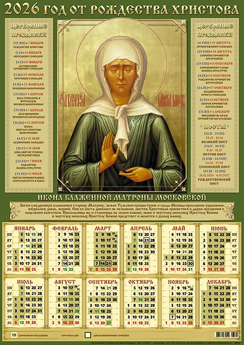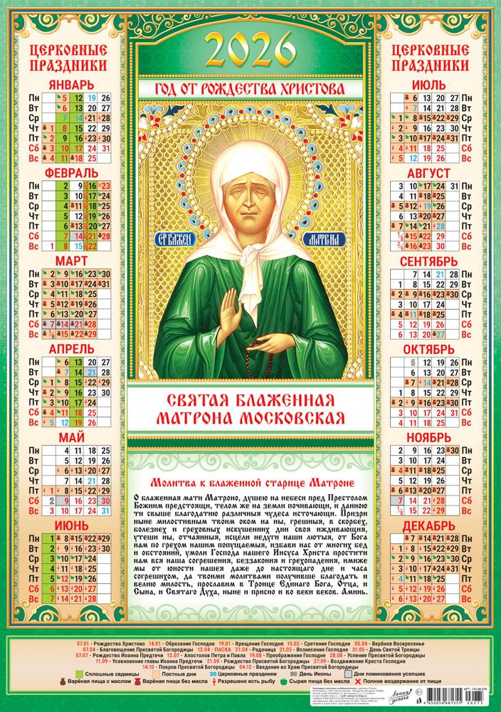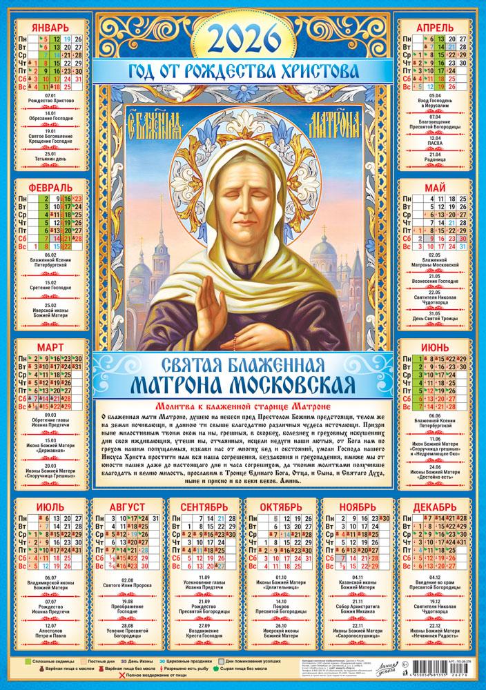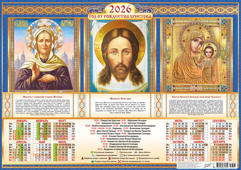 | Календарь на 2026год настенный листовой (плакат) А2 (ФОНТАНКА) ПО-26-276 Иконы Матрона Московская (без лака)  Формат А2 (420х594мм). Бумага мелованная 80 г/м2, без лака. |