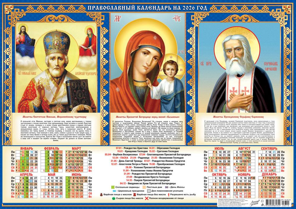| Календарь на 2026год настенный листовой (плакат) А2 (ФОНТАНКА) ПО-26-307 Иконы Триптих (без лака)  Настенный календарь - это универсальный атрибут дома и офиса. Помимо своей основной функции - сообщать текущую дату; он помогает планировать дела, подводить итоги дня, недели и месяца. Яркий и красивый календарь может служить украшением стены и оживлять дизайн помещения. Календарями пользуются бизнесмены и политики, менеджеры и преподаватели, медики, студенты и школьники. Его можно использоватьи в домашнем обиходе; отмечать события и дела, связанные с жизнью семьи, обучать ребенка ориентироваться в днях недели. Человечество изобрело календарь для того, чтобы иметь возможность планировать будущее. Формат А2 (420х594мм). Бумага мелованная 80 г/м2, без лака. |