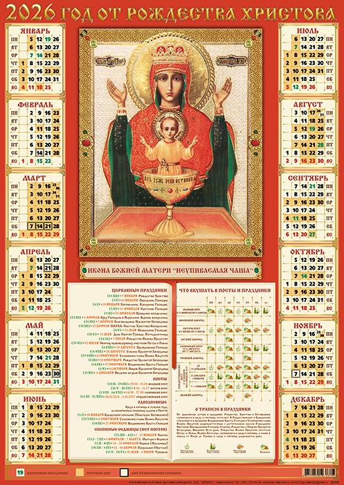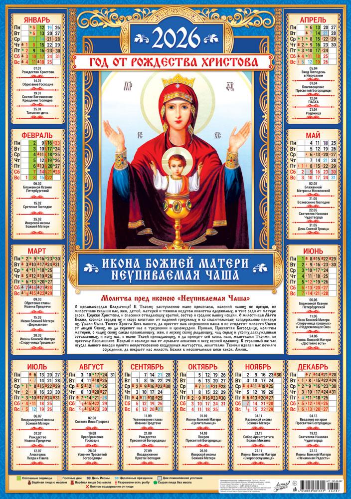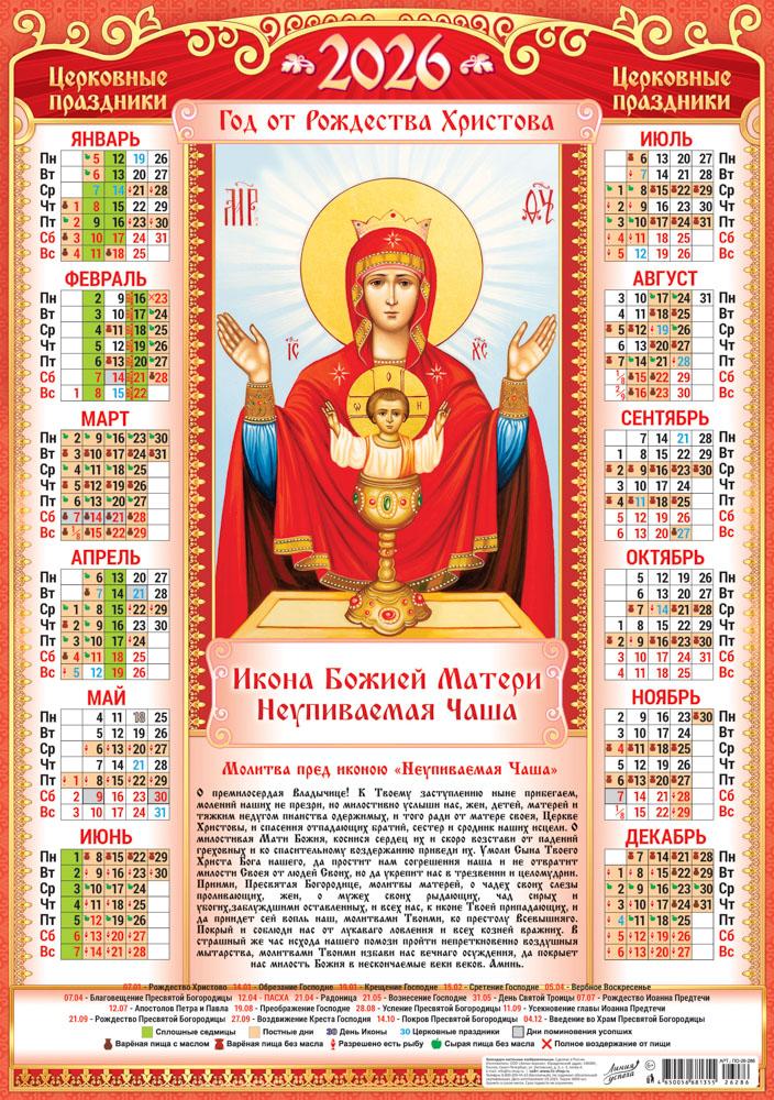 | Календарь на 2026год настенный листовой (плакат) А2 (ФОНТАНКА) ПО-26-286 Иконы Неупиваемая Чаша (без лака)  Формат А2 (420х594мм). Бумага мелованная 80 г/м2, без лака. |