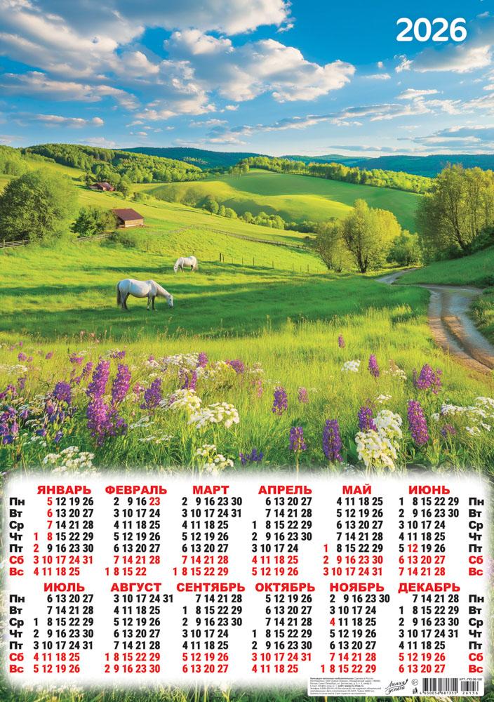 | | Календарь на 2026год настенный листовой (плакат) А2 (ФОНТАНКА) ПО-26-156 Природа Лошадки на лугу (без лака)  Формат А2 (420х594мм). Бумага мелованная 80 г/м2, без лака. |