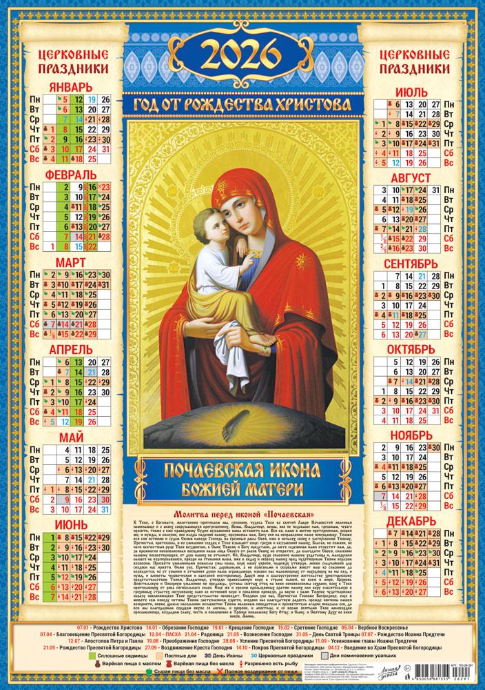 | Календарь на 2026год настенный листовой (плакат) А3 (ФОНТАНКА) ПМ-26-213 Иконы Почаевская Бож Матери (без лака)  Формат А3 (297х420мм). Бумага мелованная 80 г/м2, без лака. Настенный календарь - это универсальный атрибут дома и офиса. Помимо своей основной функции - сообщать текущую дату; он помогает планировать дела, подводить итоги дня, недели и месяца. Яркий и красивый календарь может служить украшением стены и оживлять дизайн помещения. Календарями пользуются бизнесмены и политики, менеджеры и преподаватели, медики, студенты и школьники. Его можно использоватьи в домашнем обиходе; отмечать события и дела, связанные с жизнью семьи, обучать ребенка ориентироваться в днях недели. Человечество изобрело календарь для того, чтобы иметь возможность планировать будущее. |