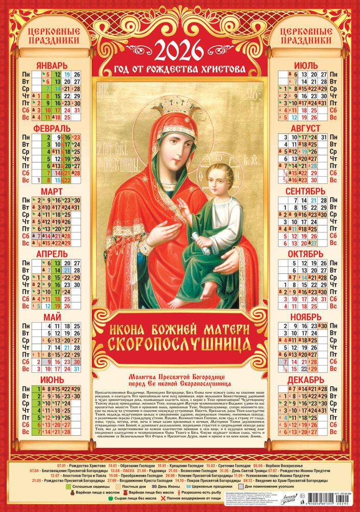 | | Календарь на 2026год настенный листовой (плакат) А2 (ФОНТАНКА) ПО-26-294 Иконы Скоропослушница (без лака)  Формат А2 (420х594мм). Бумага мелованная 80 г/м2, без лака. |