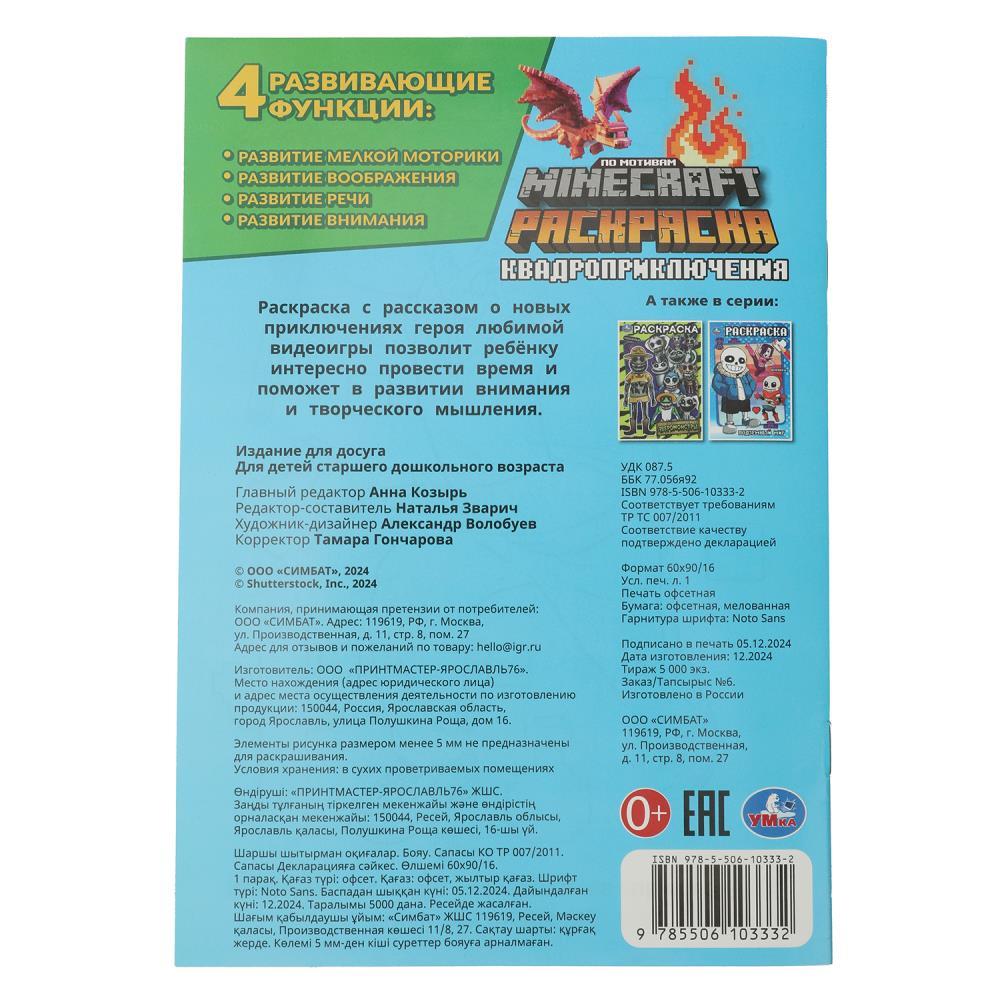 | Раскраска А5 (мелованная обложка) УМКА Квадроприключения ( 16 страниц)Марка/Производитель: УМКА  Раскраска по мотивам Майнкрафт «Квадроприключения» ТМ «УМка» приглашает детей порисовать: - чёткий контур картинок для раскрашивания - интересные и разнообразные иллюстрации - короткие комментарии к рисункам - любимые персонажи - удобный небольшой формат Юный художник будет рад встретиться на страничках этой занимательной раскраски с героями виртуальной реальности по мотивам популярной компьютерной игры. В ней он найдёт интересные картинки и сюжетные тексты к ним. Благодаря компактному размеру раскраску удобно брать с собой в дорогу. Игровые занятия с раскраской ТМ «УМка» развивают: - моторику - внимательность - творческое мышление - усидчивость Объём: 16 стр. Формат: 145 х 210 мм (А5). Материал: офсетная бумага. Рекомендовано детям старшего дошкольного возраста. |