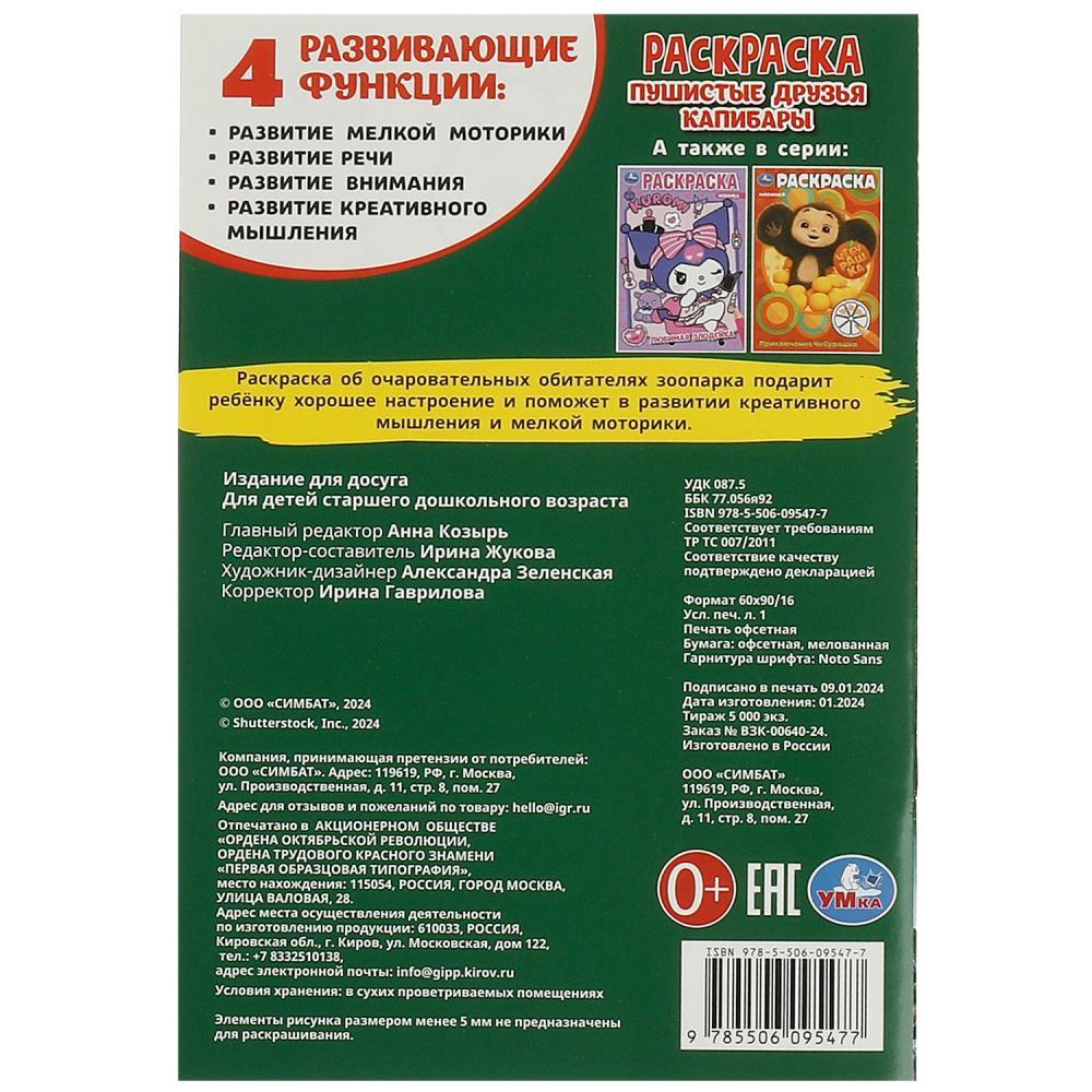 | Раскраска А5 (мелованная обложка) УМКА Пушистые друзья капибары ( 16 страниц)Марка/Производитель: УМКА  Раскраска «Пушистые друзья капибары» ТМ «УМка» - отличный подарок для маленьких художников:<br /> - картинки для раскрашивания тщательно прорисованы<br /> - короткие комментарии к рисункам на каждой странице<br /> - милые персонажи<br /> - удобный небольшой размер<br /> <br /> Эта увлекательная раскраска с забавными зверюшками непременно понравится вашему ребёнку. В ней он найдёт интересные картинки с чёткими контурами и сюжетными текстами к ним. Благодаря компактному формату раскраску удобно брать с собой в дорогу.<br /> <br /> Игровые занятия с раскраской ТМ «УМка» помогают потренировать руку к письму и способствуют развитию:<br /> - моторики<br /> - внимания<br /> - творческого мышления<br /> - усидчивости<br /> <br /> Объём: 16 стр |