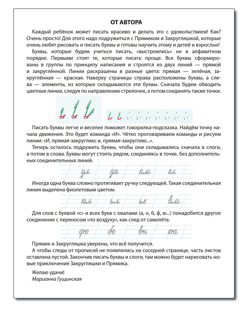 | | Прописи СФЕРА Прописи для идеального почерка 5-7лет Гущинская ( 32 страницы)  Тетрадь «Прописи для идеального почерка» является уникальным пособием для дошкольников и младших школьников. Авторская методика М.В.Гущинской, логопеда и коррекционного педагога, помогает в игровой форме сформировать у детей красивый разборчивый почерк через простой алгоритм соединения двух элементов. Два оригинальных персонаж: Прямик и Закругляшка научат писать буквы, используя прямые и закруглённые линии, и порадуют интересной историей в комиксах. Прописи помогут: — развить мелкую моторику ; — улучшить координацию движений; — сконцентрировать внимание и память; — подготовить руку к письму. — сформировать красивый почерк. |