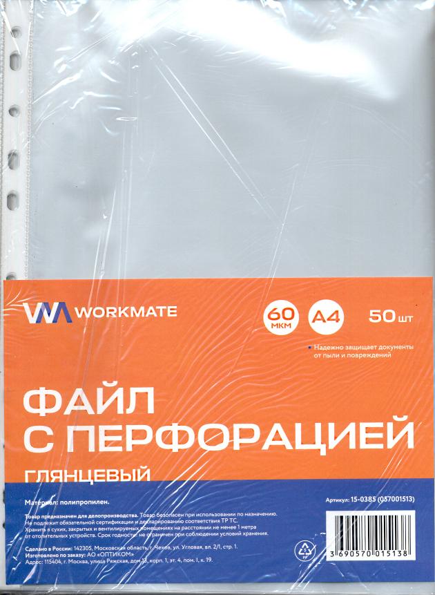 | Мультифора (файл вкладыш с перфорацией) А4 1шт 60мкм WORKMATE глянцевая  Файл с перфорацией Workmate выполнен из прозрачного полипропилена толщиной 60 мкм. Предназначен для бережного хранения и транспортировки документов формата А4. Вмещает в себя до 50 листов стандартной плотности. Имеет глянцевую поверхность. Перфорация файла подходит для всех видов скоросшивателей. В упаковке 50 штук. |