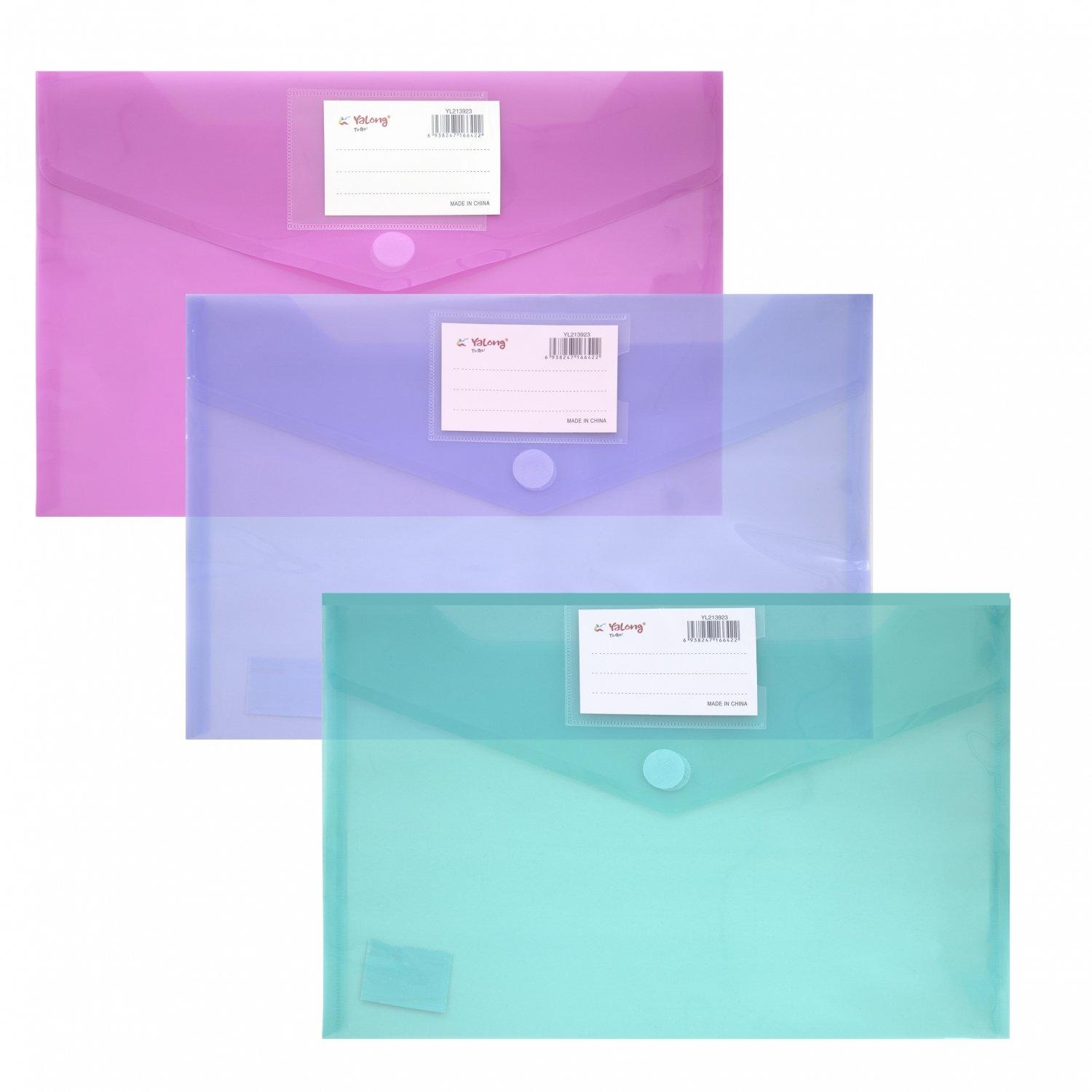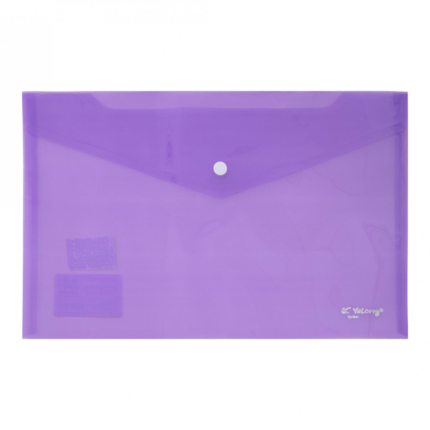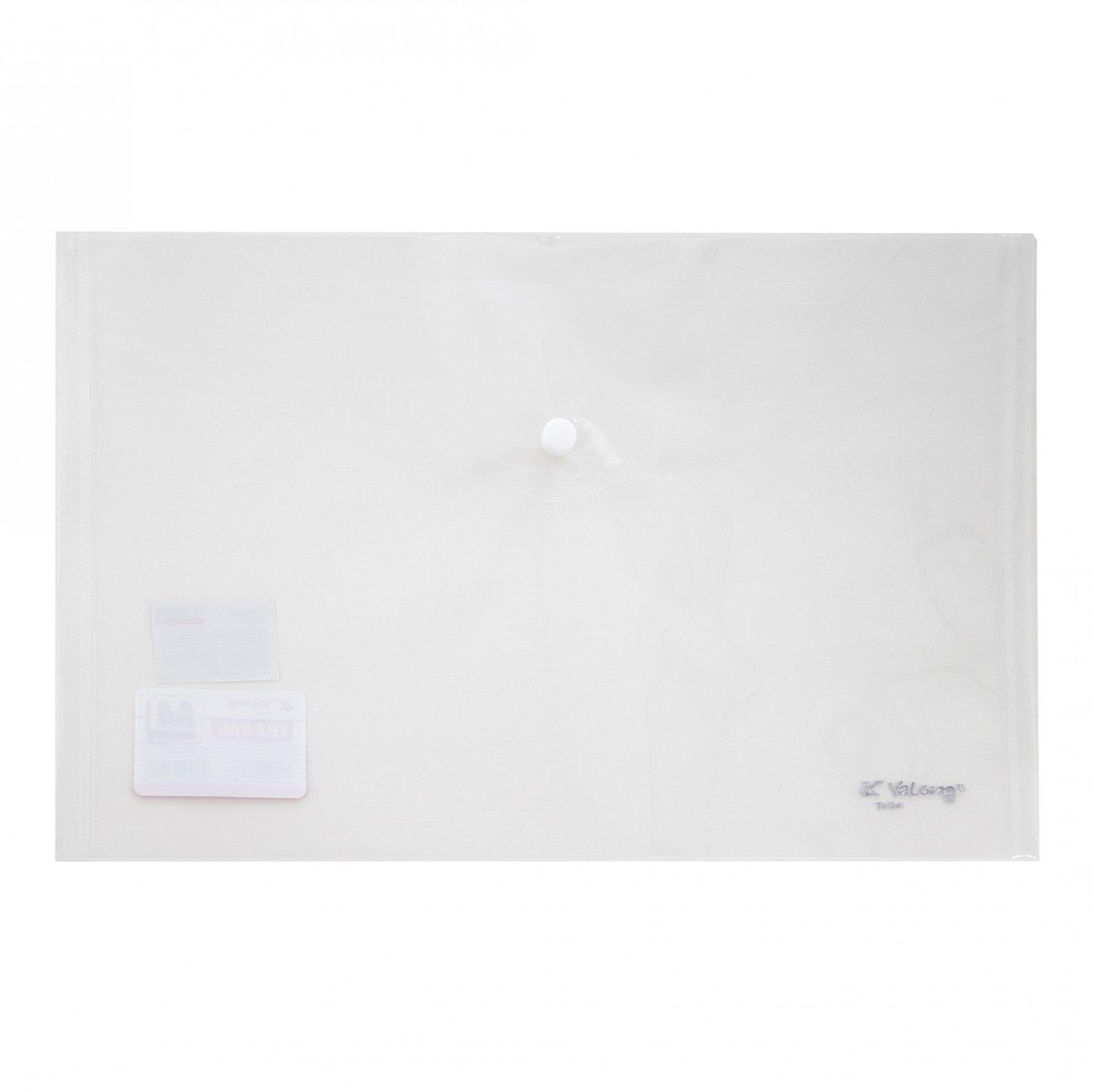 | Папка на кнопке А4 (230*330) YALONG 140мк пласт прозрачная Ассорти  Папка-конверт закрывается клапаном с кнопкой. Подходит как для хранения, так и транспортировки документов, предохраняя их от загрязнения и смятия. Папка-конверт на кнопке Yalong, A4, 230х330 мм, 140 мкм, ассорти в коробе, прозрачная |